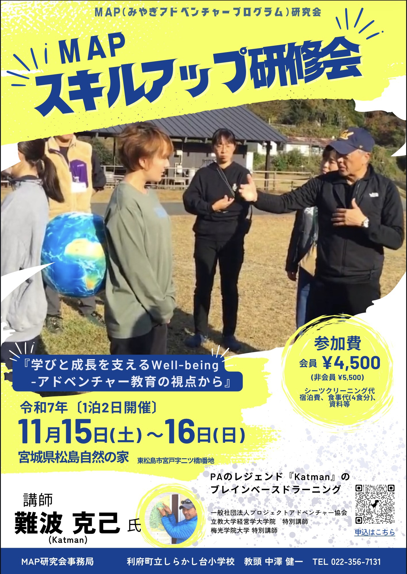 MAP研究会のウェブサイトへようこそ!私たちは宮城県で学校の中に冒険教育を取り入れていこうと志す仲間が集まった自主的な研究会です。このサイトでは,私たちの研修の様子を画像とともに紹介しています。