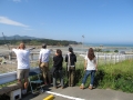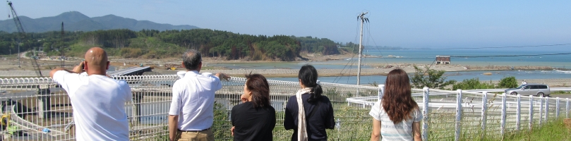 ここもジェームズの取材場所です。避難所となっている小泉中学校を訪問しました。ジェームズが取材している間,他の参加者は津谷川沿いの低地と海を見渡せる場所に行き,途中で寸断されたJR.気仙沼線の高架橋やそこにあったはずの陸前小泉駅のあたり,何もなくなってしまった平野部の茶色い風景などを眺めて,津波の威力を感じました。海はきれいな水色で,目の前の津波の被災地の景色と激しいコントラストをなしていました。