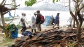 海岸には気仙沼市内から流されてきたと思われる,燃えてすすけた木材や,漁師さんが魚を入れるために使う大きなコンテナが散乱していて,100人以上のボランティアが一生懸命片付けをしていました。コンテナは全体が砂の中に埋没していて,スコップで掘り出す作業は大変そうでした。